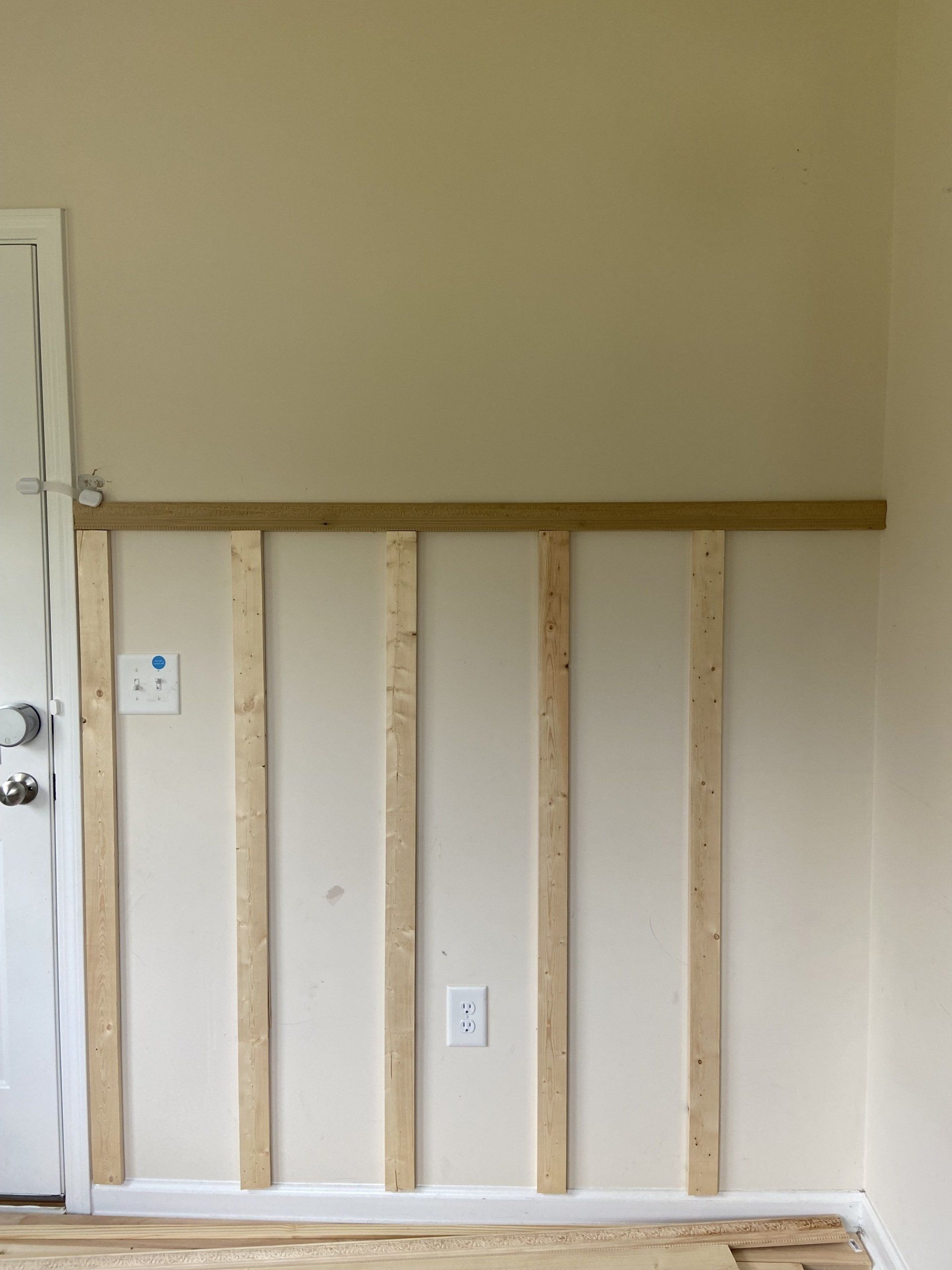 I first measured the wall and decided what height I wanted the board and batten to be. My ceiling height is 9 feet so I kept the board height to be : 5 feet board + 4" trim + 3" baseboard. I then marked it all out and mapped the space from 2 extreme edges and decided what distance I wanted the boards to be from each other.
