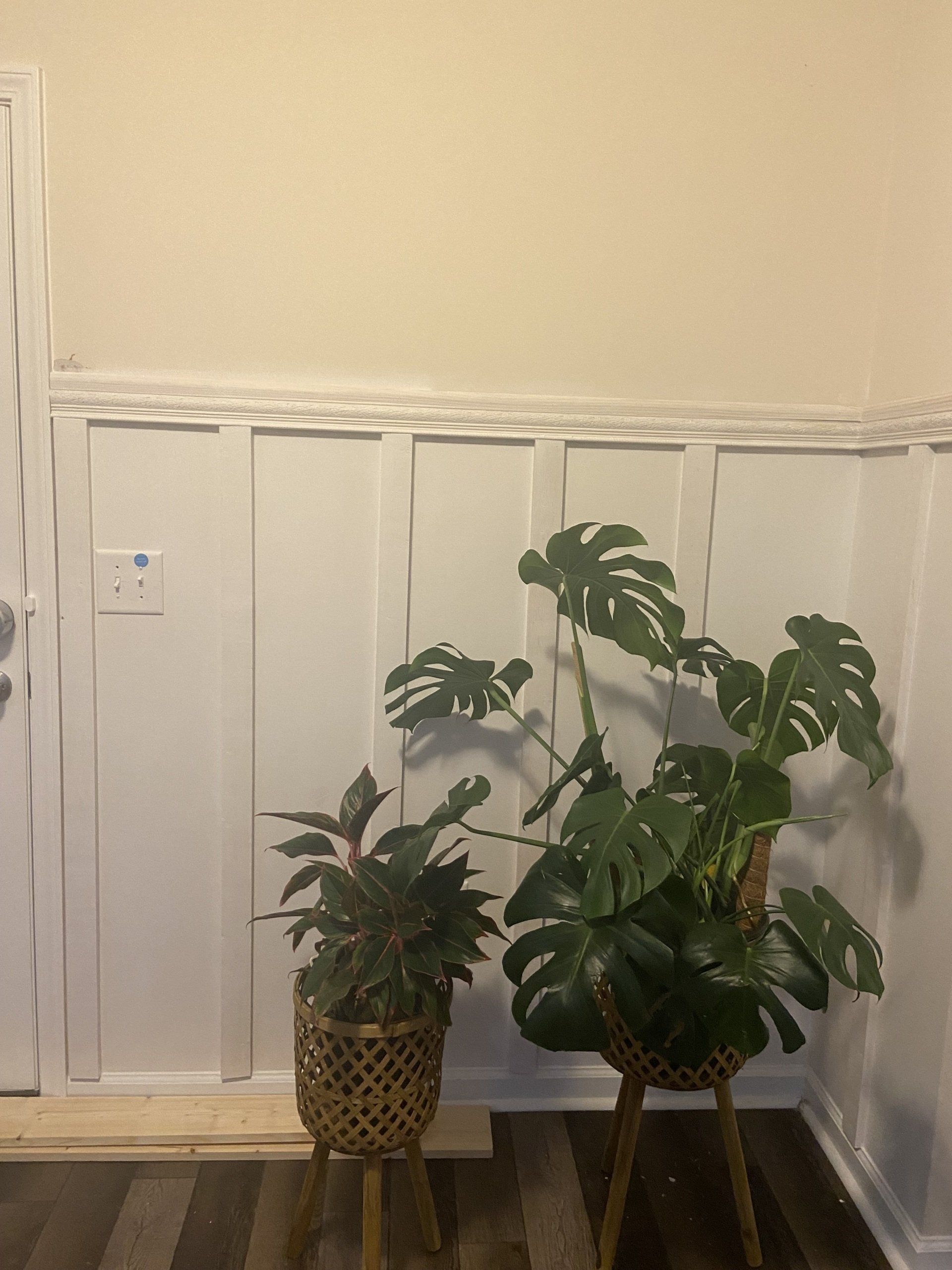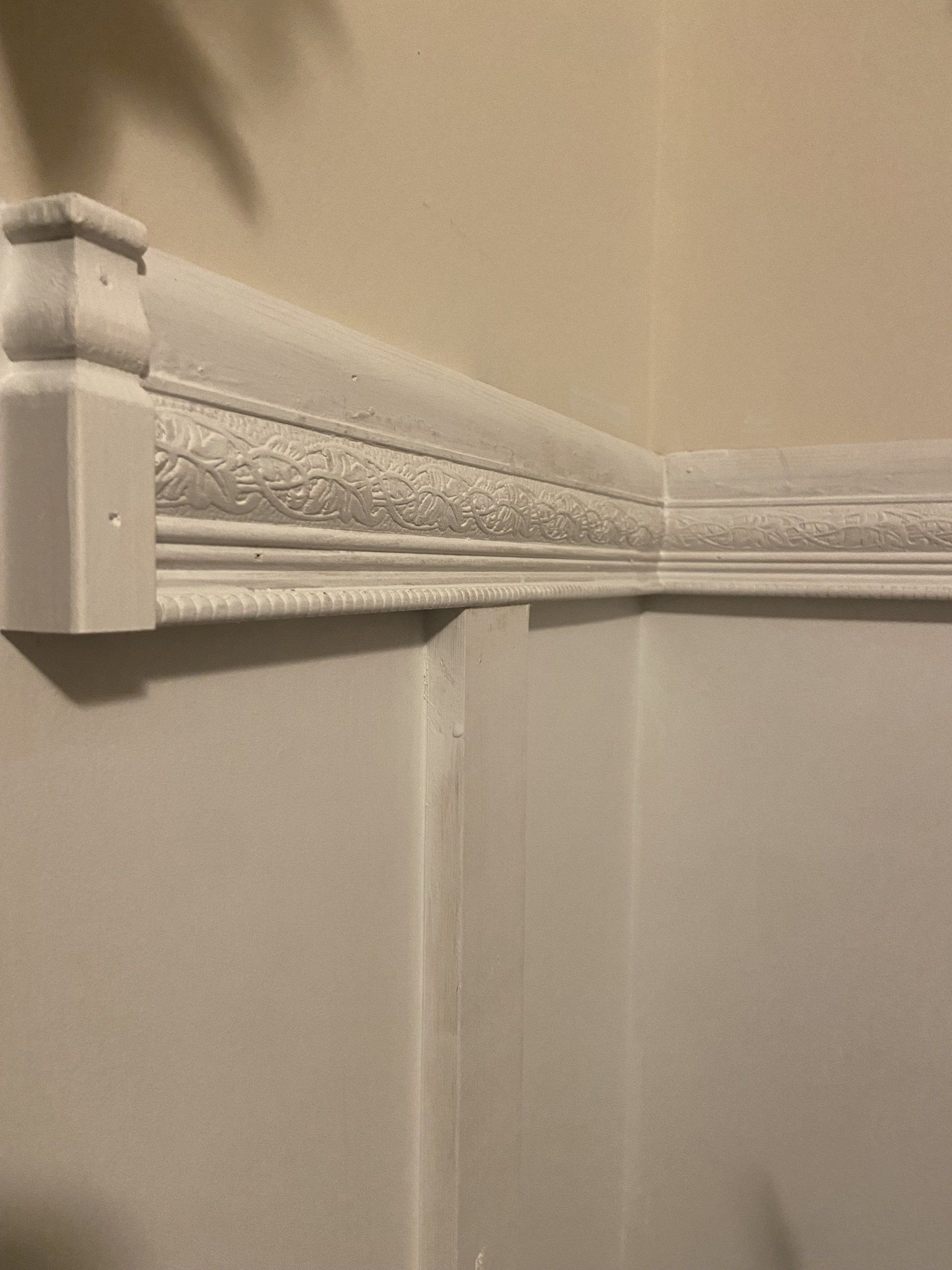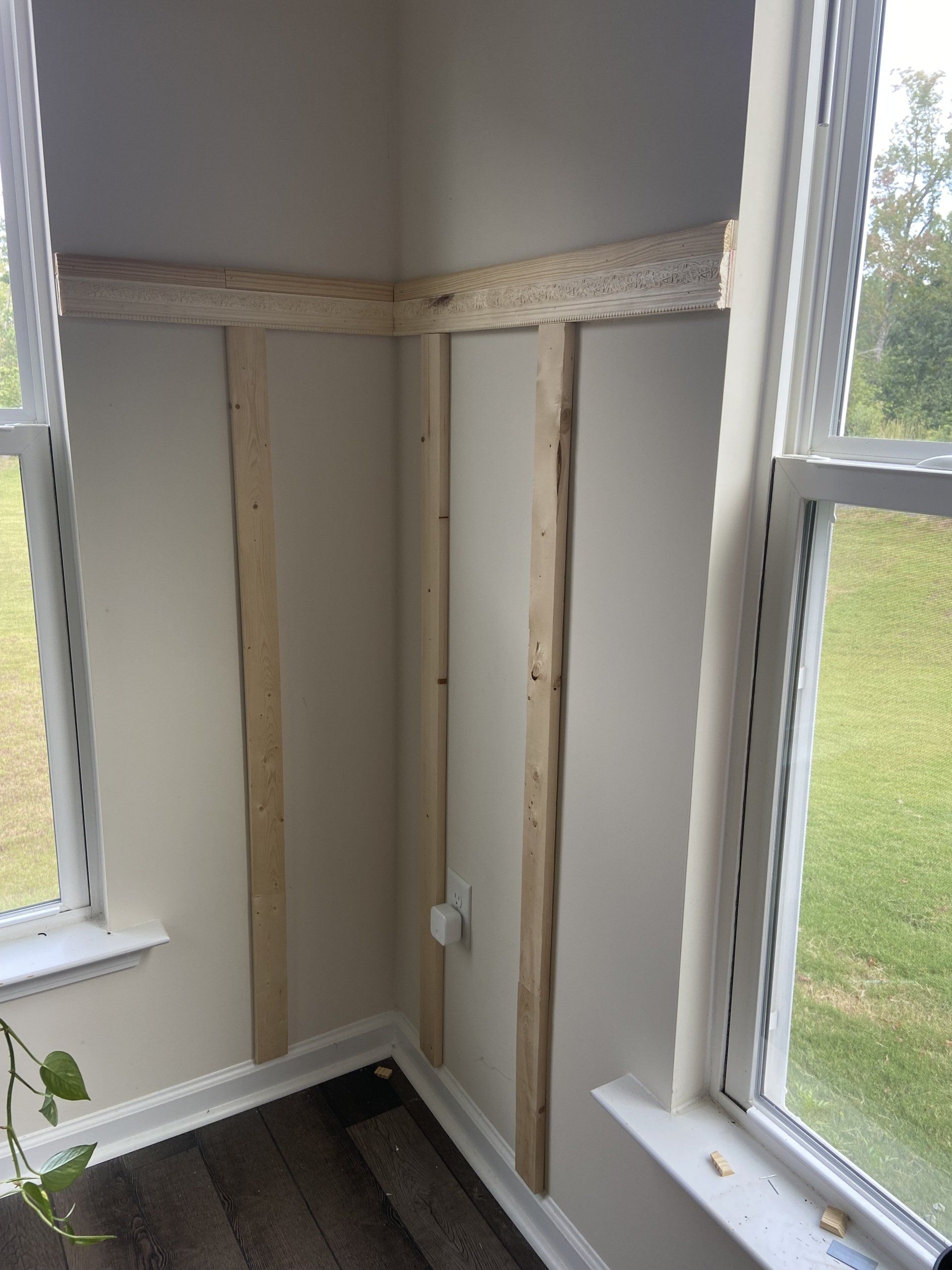 For the horizontal trim I decided to choose a carved trim to bring in the boho indian vibes. I try to incorporate a little bit of India in my house in any way I can. Trim SIze : 2-1/4-in : Lowes Ornamental Moulding . I wanted a wider 4" horizontal trim section so I added another trim of 11/16-in to add to the height : Lowes 11/16 in trim.