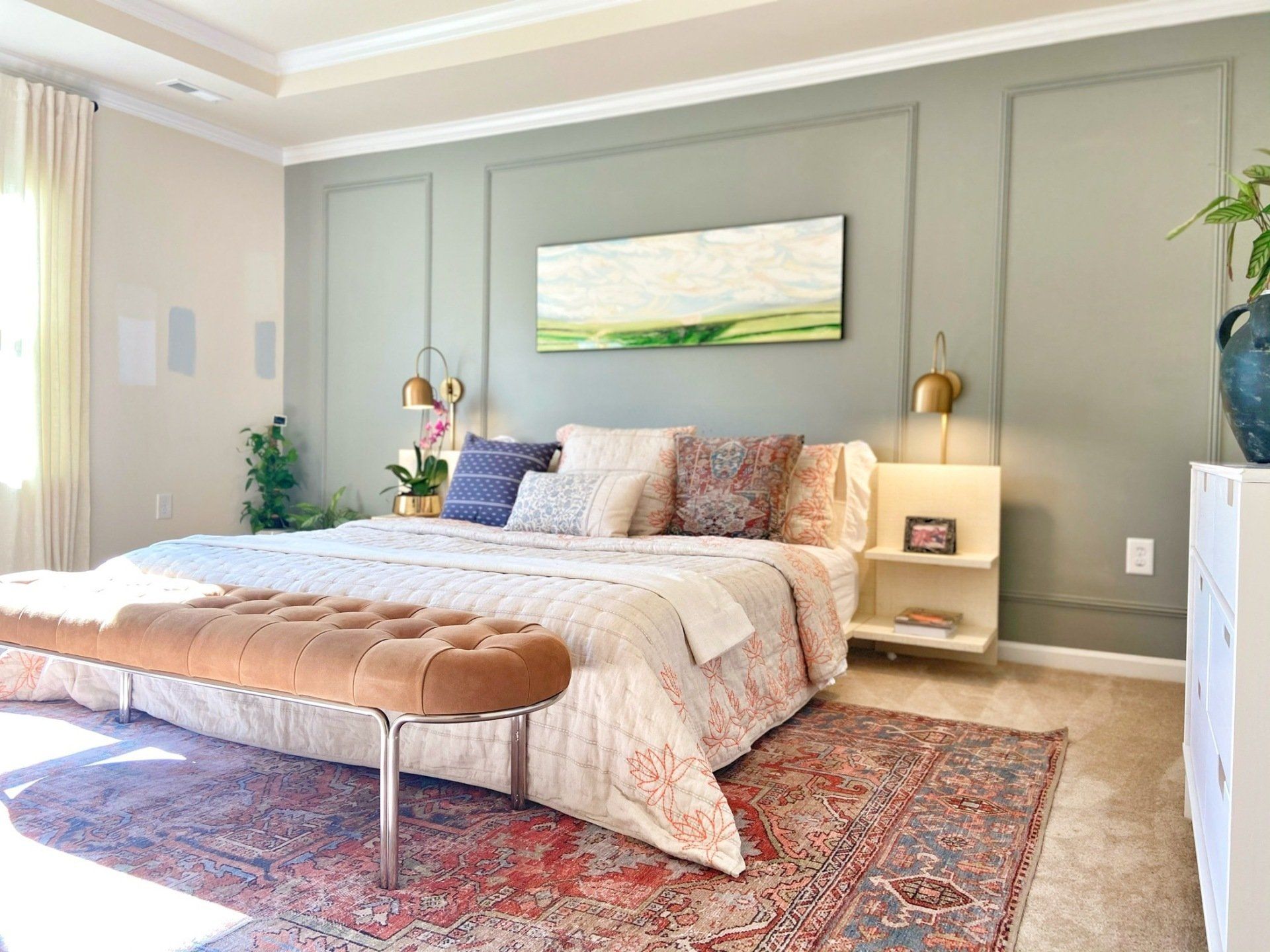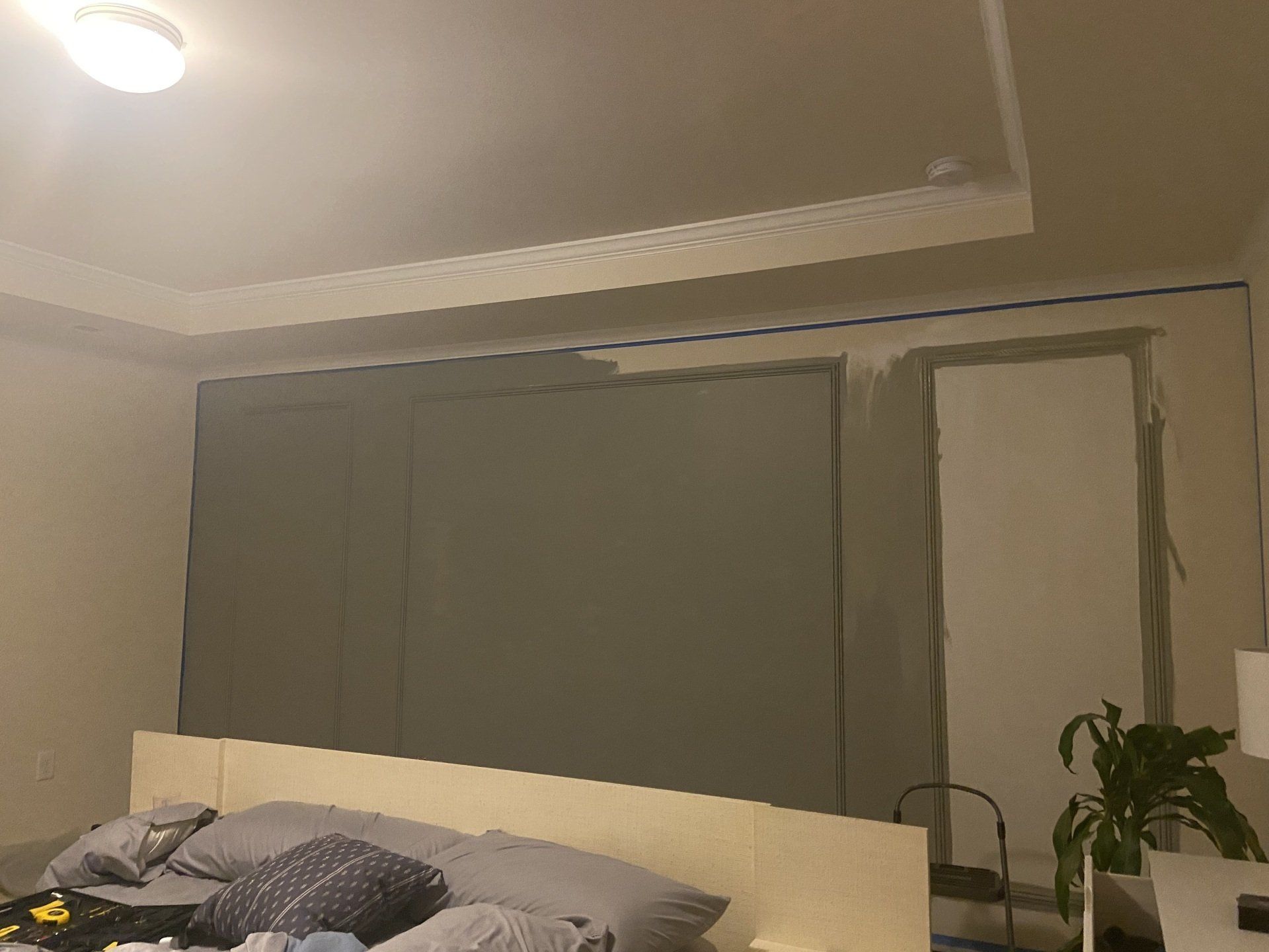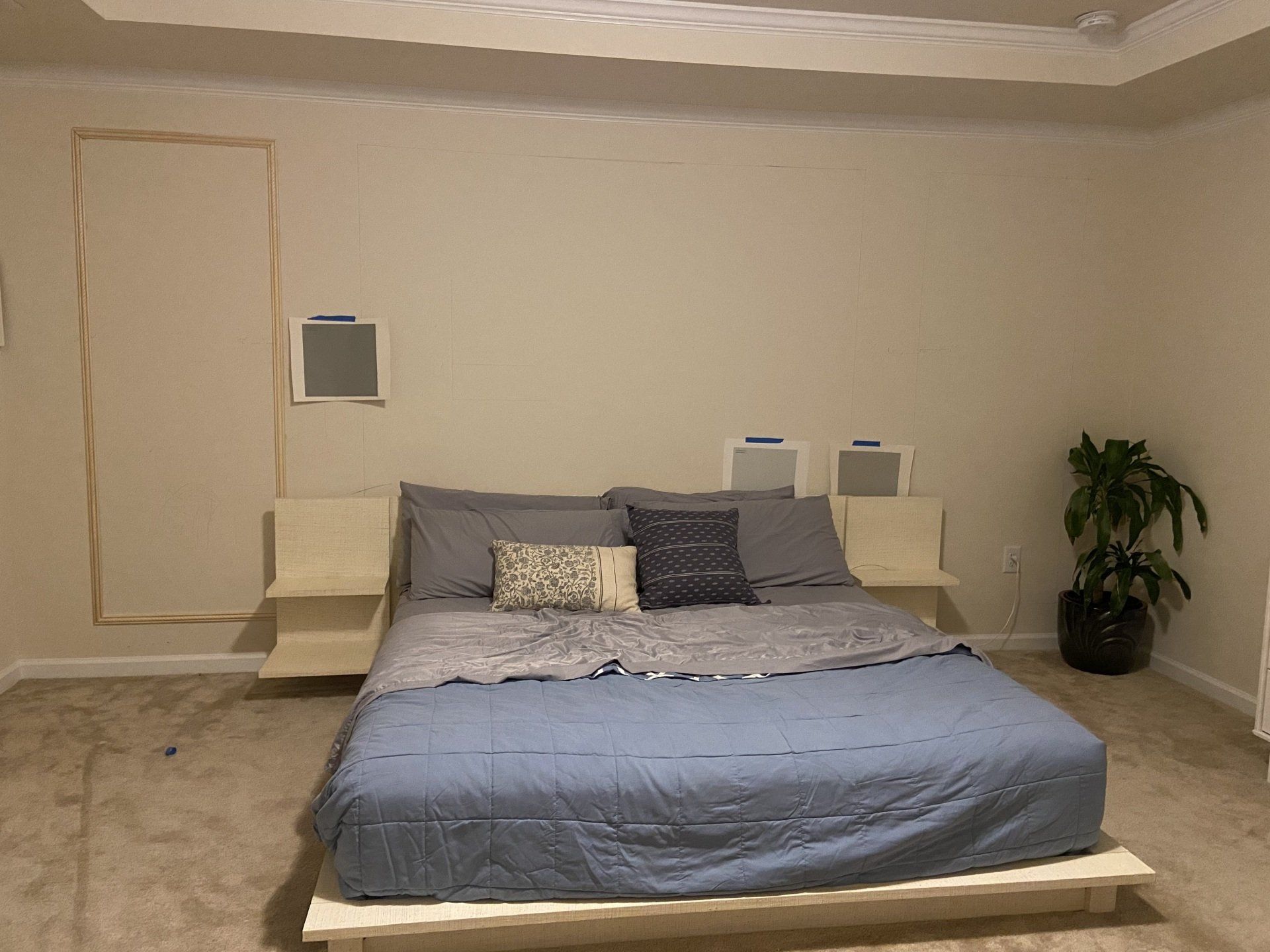 Let's get started with mapping the wall. I changed my bed to a low frame bed and mapped teh bed to be the center of the wall. I decided I will have 3 squares - 1 big in the center to hold teh painting, 2 on the sides. I created a mood board and went from there.