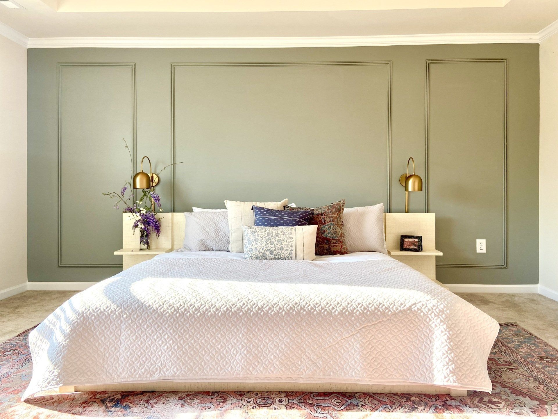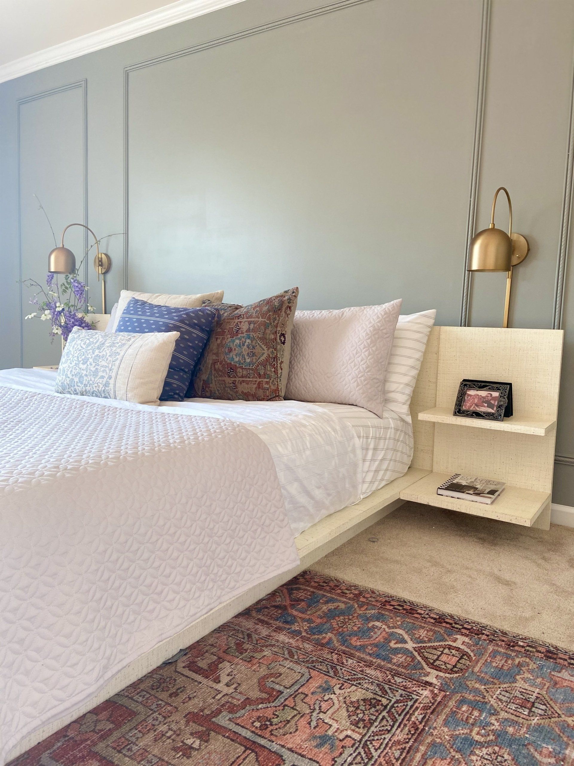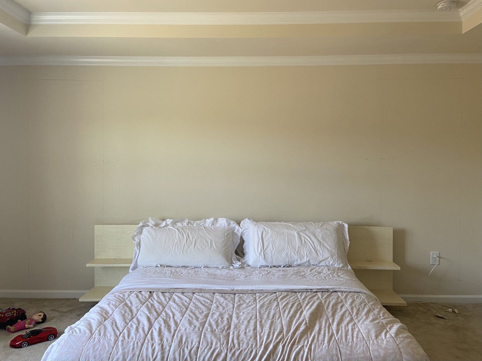 Let's get started with mapping the wall. I changed my bed to a low frame bed and mapped teh bed to be the center of the wall. I decided I will have 3 squares - 1 big in the center to hold teh painting, 2 on the sides. I created a mood board and went from there.